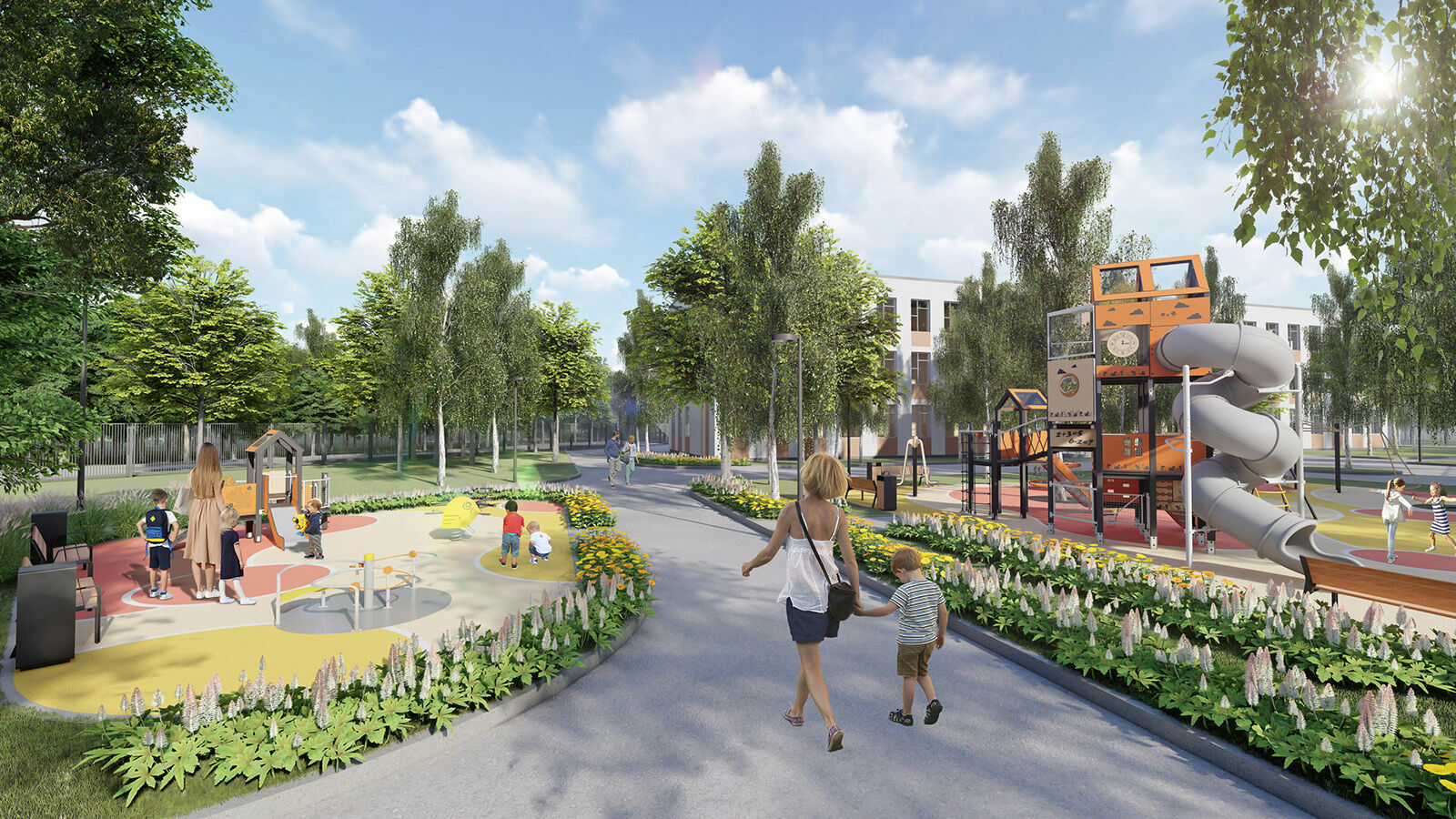 Вокруг здания школы проложен единый игровой маршрут, соединяющий в себе разнообразные функциональные зоны. Каждая игровая зона имеет свою функцию. Все площадки безопасны и имеют развивающую направленность. Игровой блок “Сад” включает в себя обучающие тактильные игры, оранжерею, аптекарский огород, которые могут использоваться в образовательных целях во время уроков. Все зоны игровых площадок разделены озеленением и различными посадками. За счет плавных и естественных линий в планировке и озеленении, вдоль маршрута формируются уединенные площадки с комфортной и защищенной средой.